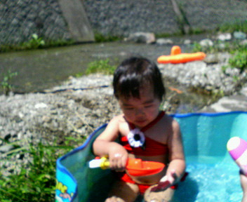 ゆいちゃん初の川で、きゃーきゃーいいながら楽しそうに流れに逆らったり岩の間を歩いたりしてました。かなりテンション高かったです。流れが少しキツイ所もあったので私がずっと手を引いてあげてたんですが、ゆいちゃんのハイテンションに押されっぱなしでしたよ(>_<)